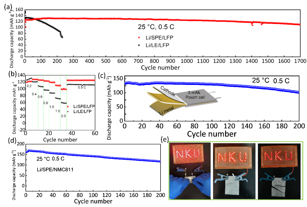 图5.SPEs固态电池的电化学性能和Li/SPE/LFP软包电池的照片。(a)Li/SPE/LFP和Li/LE/LFP电池在25℃、电流密度0.5C下的循环性能。(b)Li/SPE/LFP和Li/LE/LFP纽扣电池的倍率性能。(c)Li/SPE/LFP软包电池在25℃、0.5C电流密度下的循环性能。(d)Li/SPE/NMC811电池在25℃、电流密度0.5C(1C=180mAh g-1)下的循环性能。(e)Li/SPE/LFP软包电池在折叠、穿钉和切碎状态下的照片。