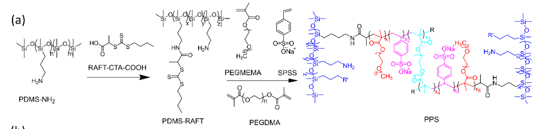如流程图1所示,PPS弹性网络的合成利用自由基聚合制备。单体中的PEGMEMA能够提供均匀的离子传输通道,PDMS赋予聚合物一定的弹性而SPSS以及交联剂的使用,进一步增强了弹性网络的机械强度。