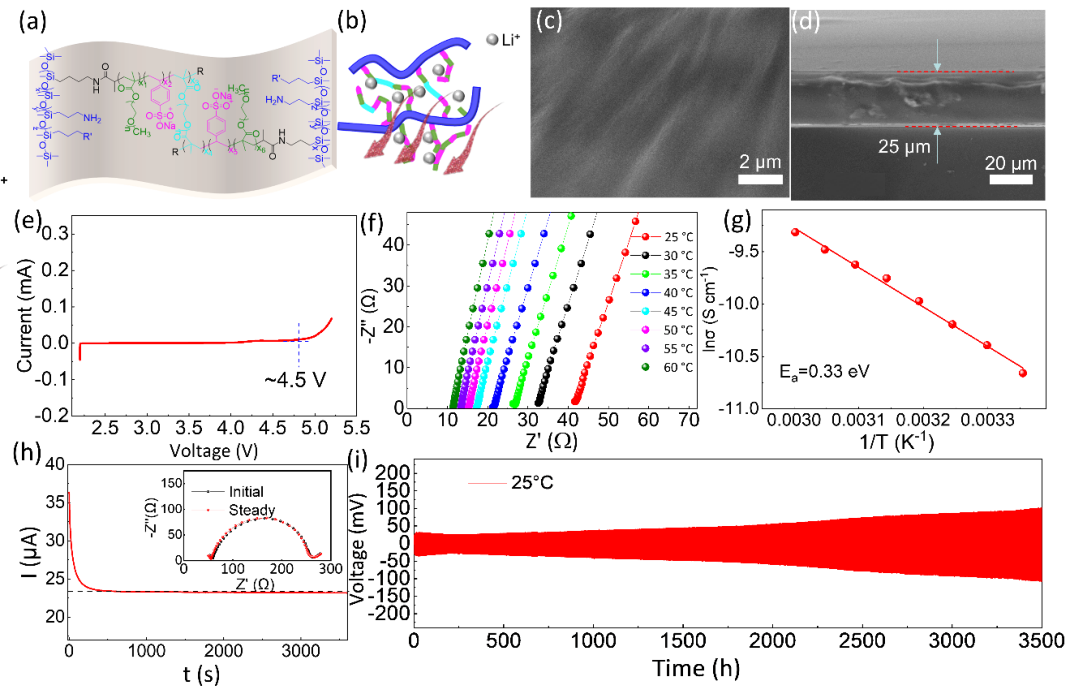 图4. SPEs的表面形态和电化学性能。(a) 所制备的SPE的示意图。(b)锂在SPEs中传输的示意图。(c) SPEs的SEM图。(d) SPE的横截面SEM图。(e) SPE的LSV曲线。(f) SPEs从25℃到60℃的EIS曲线。(g) SPE的离子电导率的VFT拟合。(h) 外加电位为10 mV的恒电位极化曲线和相应对称电池的EIS曲线。(i) Li/SPE/Li对称电池在25 ℃的循环性能。
