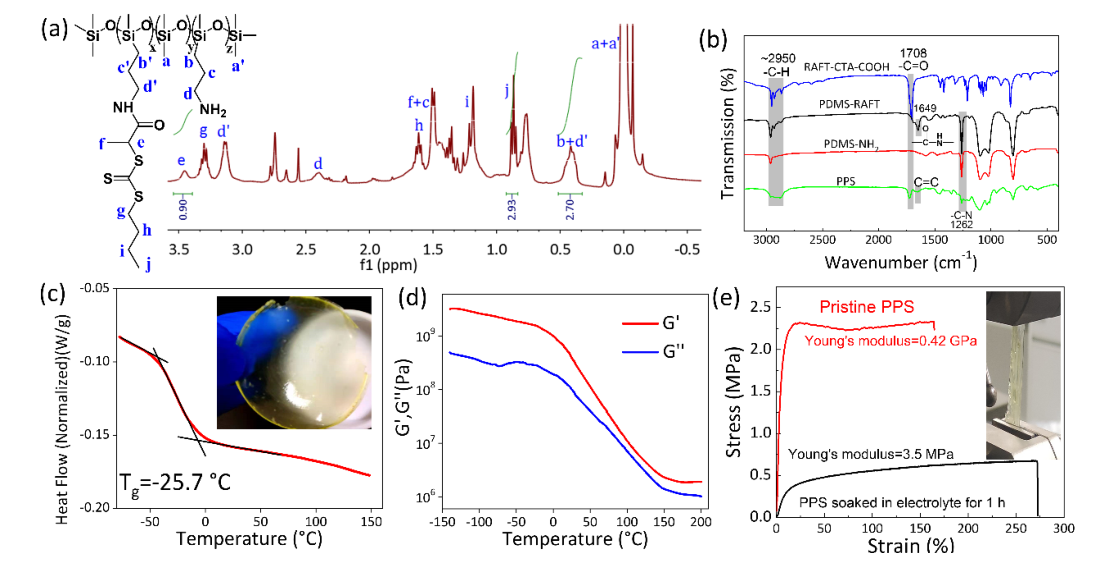 图1. 所制备聚合物的表征。(a)PDMS-RAFT的1H核磁共振波谱。(b)RAFT-CTA-COOH、PDMS-RAFT、PDMS-NH2和PPS的FT-IR光谱。(c) PPS聚合物的DSC曲线和PPS膜的照片。(d) PPS聚合物的流变性分析。(e)PPS在电解液(1M of LiPF6 in EC/EMC)中浸泡1h前后的拉伸试验。插图为拉伸后的PPS薄膜的照片。