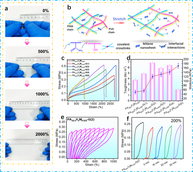 图2. PAM/PVA/MXene复合有机水凝胶的刺激响应单元和力学性能