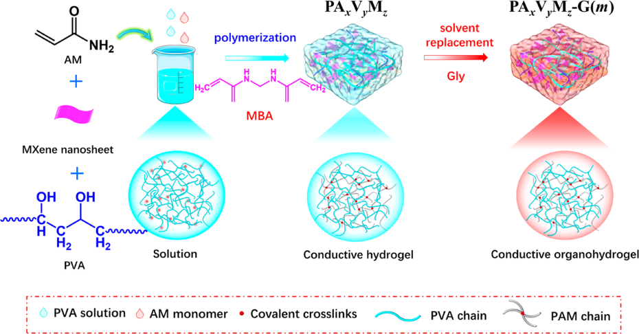 图1. PAM/PVA/MXene复合水凝胶和有机水凝胶的合成路线及网络结构