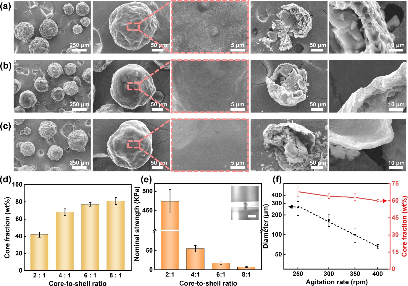 研究人员采用油/油乳液溶剂蒸发的方法,首次通过一锅法直接机械搅拌乳化制备了ILSTF微胶囊。微胶囊的制备需要先将芯材剪切乳化,但是STF的剪切增稠效应使之难以直接剪切乳化。目前相关报道中只有通过微流控的方法制备了毫米级尺寸的STF胶囊,尚无通过一锅法机械搅拌制备STF微胶囊的方法。研究人员巧妙利用溶剂蒸发法制备微胶囊的原理,先使用大量的丙酮溶剂稀释ILSTF,使芯材流变性能反转,从剪切增稠变成剪切变稀,从而得以通过机械搅拌方式直接乳化芯材。在微胶囊成壳过程中,随着溶剂的逐渐挥发及ABS壳材的相分离析出,芯材最终只剩下纯ILSTF,再次出现流变性能反转,恢复其剪切增稠性能,从而首次成功通过一锅法制备了微米级尺寸的ILSTF微胶囊(图2)。研究人员系统性地研究了ILSTF微胶囊成壳行为和参数的影响和优化,最终制备了具有优异热稳定性、芯材含量高、机械性能好、粒径可控的ILSTF微胶囊(图3)。