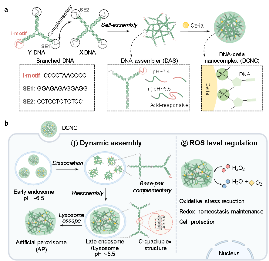 仰大勇教授团队构建了一种DNA/氧化铈纳米复合物(DCNC),实现细胞内动态组装,构建人工过氧化物酶体(AP),有效清除胞内ROS,并研究对ROS失衡细胞的生物学行为影响。氧化铈与枝状DNA的磷酸骨架通过配位作用形成纳米尺寸的复合体。进入细胞后,DCNC依次响应早期内涵体和晚期内涵体/溶酶体内的酸性环境,发生自主解组装和再组装,在细胞内部原位形成AP。在细胞中,AP通过氧化铈的功能模拟过氧化物酶体清除高浓度ROS的功能,防止细胞氧化应激。DNA分子可控组装赋予组装材料理性可调的尺寸效应,很好地解决了材料细胞摄取与细胞内滞留的矛盾,纳米尺寸的DCNC有利于细胞摄取,而DCNC在细胞内组装形成AP后尺寸增大,有效延长了胞内滞留时间,增强了ROS清除功效。在此基础上,通过氧化应激模型研究了AP对细胞生物学行为的影响。结果表明,AP通过降低细胞内ROS水平、维持稳定的谷胱甘肽浓度,保护细胞骨架不受损伤,进而维持了细胞的迁移能力。对线粒体膜电位、Ca2+浓度以及胞内ATP水平的测定,证明AP能够使细胞在受到ROS攻击后仍维持正常的代谢以及生理活动。此外,细胞活性等相关实验验证,AP能够使细胞在高浓度H2O2环境中仍维持高活性,有效地抑制了细胞凋亡。该工作证明了在细胞内原位构建AP的可行性,并且验证了清除ROS的能力,这是未来进一步应用的必要基础。这项工作启发研究者利用胞内复杂的生物微环境,以及细胞和亚细胞水平上生物刺激的差异性,在特定位置进行可控组装,调控细胞或细胞器功能,为疾病干预和治疗探索新的途径。
