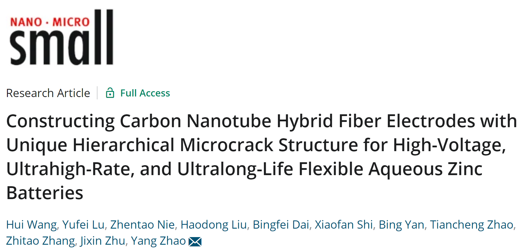 论文信息:Hui Wang, Yufei Lu, Zhentao Nie, Haodong Liu, Bingfei Dai, Xiaofan Shi, Bing Yan, Tiancheng Zhao, Zhitao Zhang, Jixin Zhu, and Yang Zhao*, Constructing carbon nanotube hybrid fiber electrodes with unique hierarchical microcrack structure for high-voltage, ultrahigh-rate and ultralong-life flexible aqueous zinc batteries, Small 2022, DOI: 10.1002/smll.202206338.