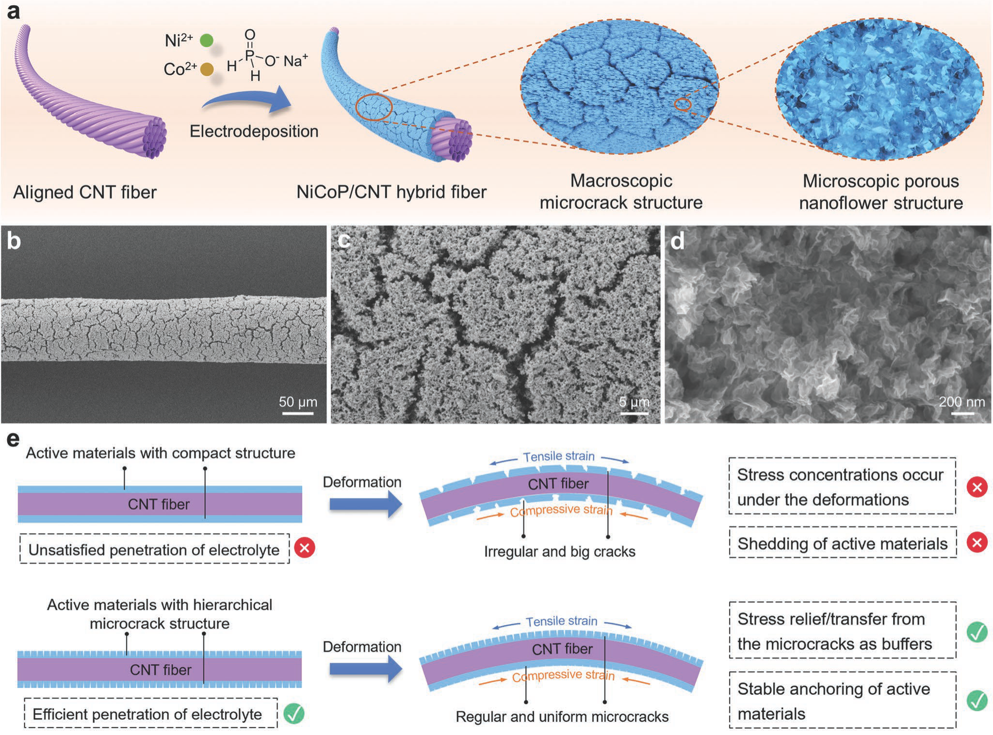 图1. 具有多级微裂纹结构的柔性复合电极的结构和形貌表征