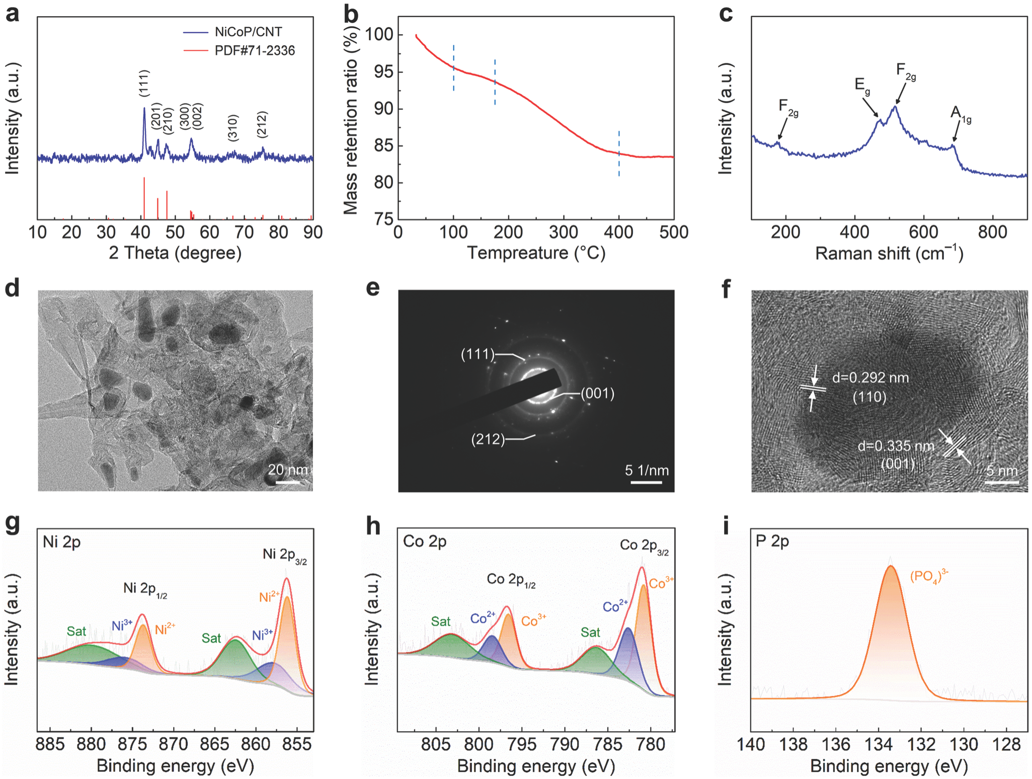 图2. 双金属磷化物/碳纳米管柔性复合电极的表征