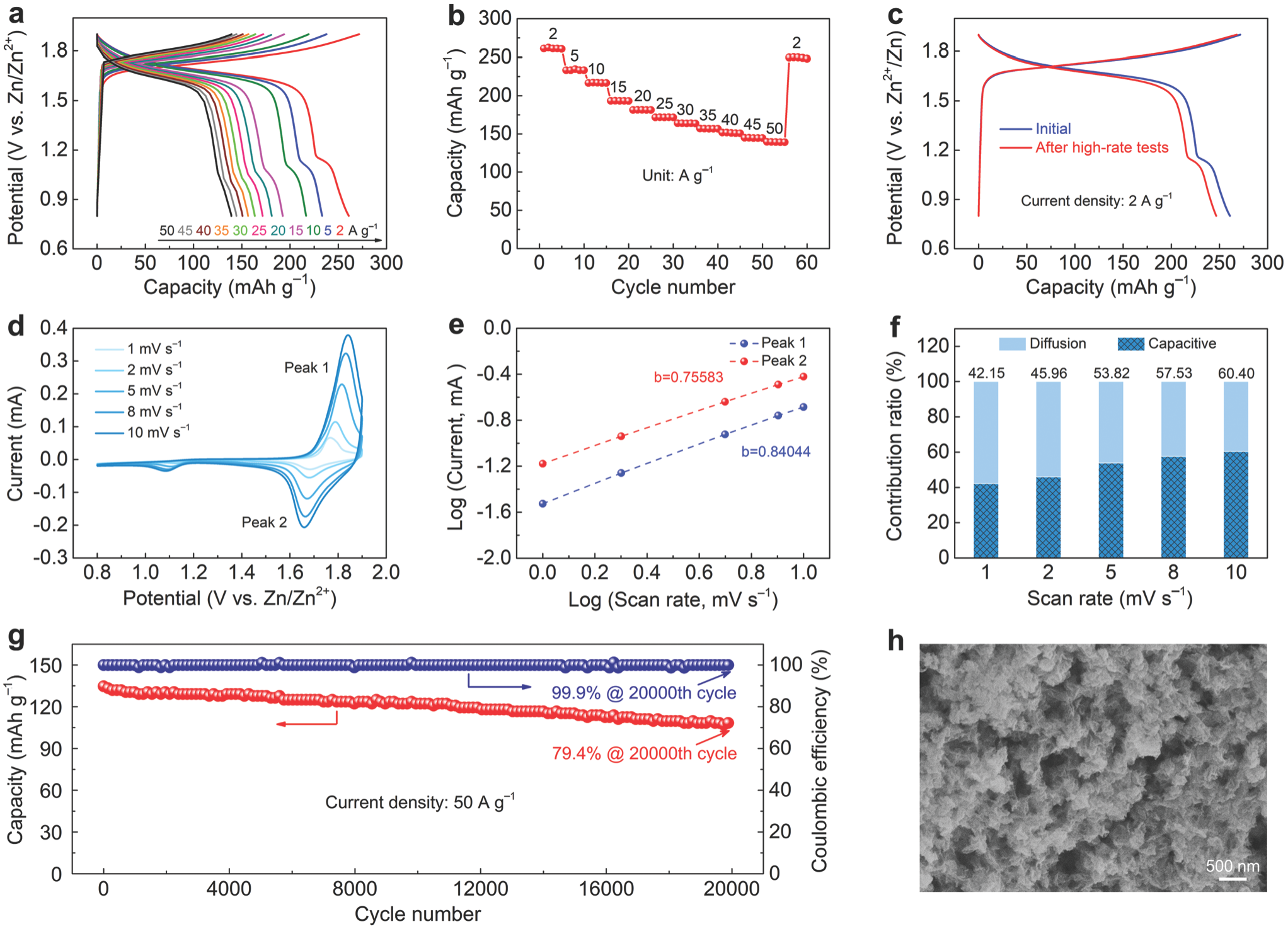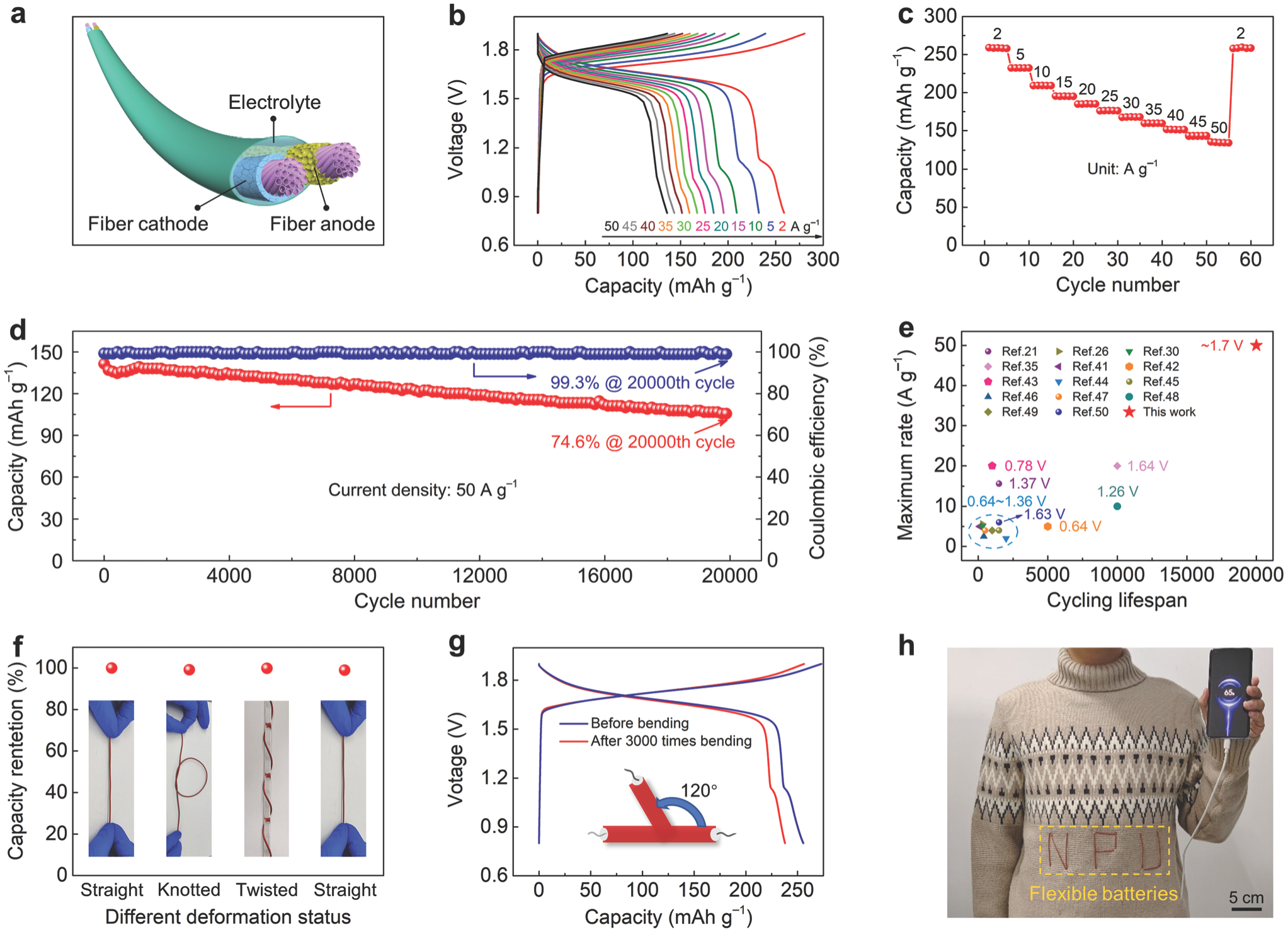 近日,西北工业大学赵阳副教授团队报道了一种具有多级微裂纹结构的柔性复合电极材料,其具有独特的宏观微裂纹结构和微观多孔纳米花结构。多级微裂纹结构不但能够促进电解质的渗透和内部活性位点的有效暴露从而实现电荷的快速传输,而且能够有效缓解电极在形变时的应力集中,赋予复合电极优异的电化学性能和高的机械柔性。基于该电极所制备的柔性水锌电池具有高的工作电压平台和比容量(≈1.7 V, 258.9 mAh g?1),超高的倍率性能(在50 A g?1的电流密度下比容量为135.8 mAh g?1)和超长的循环寿命(在20000次循环充放电后容量保持率为74.6%)。此外,该柔性电池可承受3000次弯曲(容量保持率为93.1%),展现出优异的柔性,并可轻松编织成柔软的电子织物为智能手机供电。