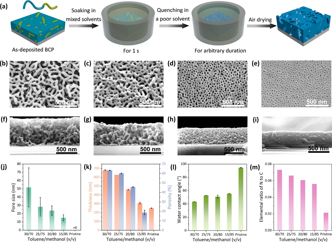基于以上考虑,King Abdullah University of Science and Technology的郭雷鸣博士(现为东华大学纺织学院研究员)等人受嵌段共聚物在溶剂中的溶解现象启发,通过将溶剂与非溶剂混合延缓嵌段共聚物溶解速度、再利用非溶剂终止溶解过程的方法获得了孔道贯穿的薄膜结构。混合溶剂处理1秒即可将嵌段共聚物密实薄膜转变为纳米多孔膜。调控溶剂和非溶剂的混合比例可赋予嵌段共聚物膜不同的孔型、孔径和孔隙率。