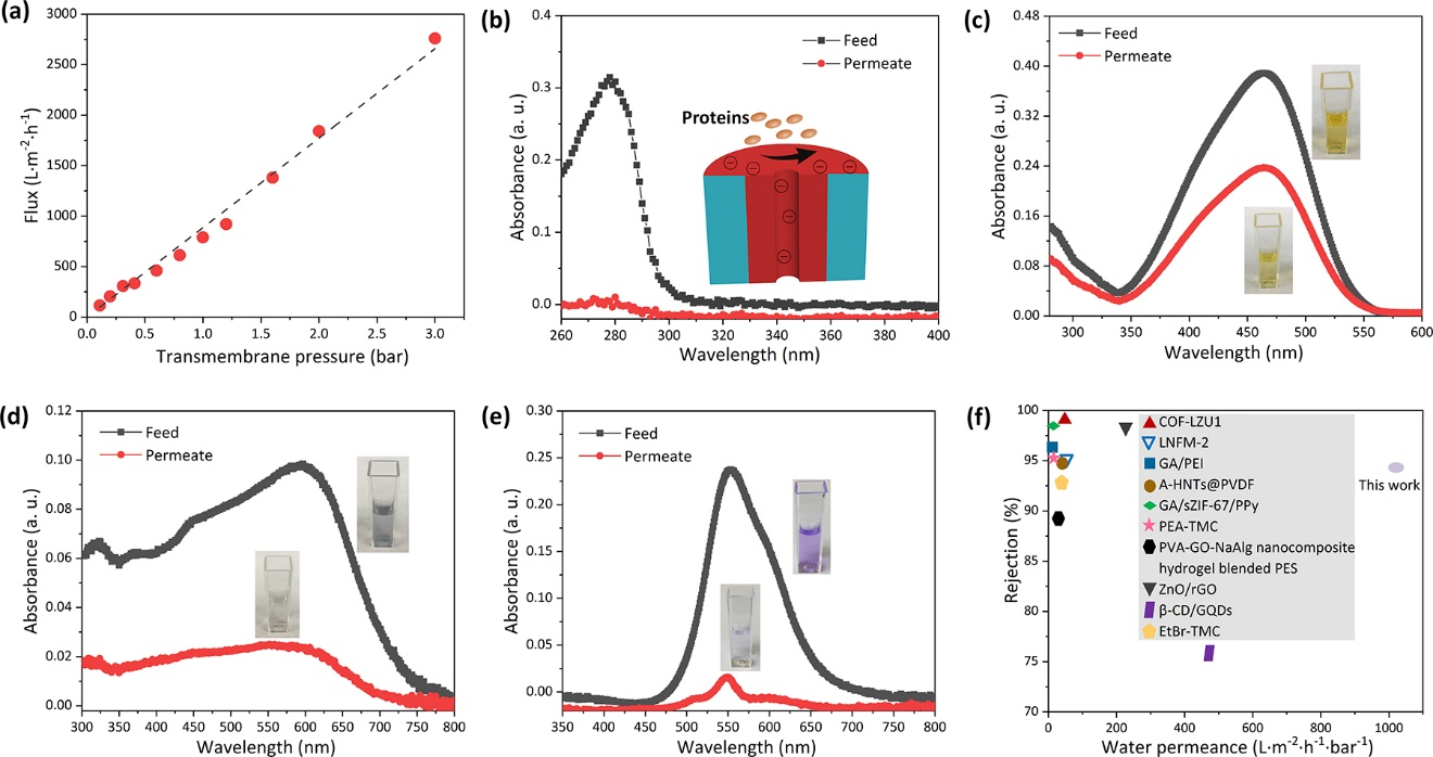 基于对聚苯乙烯基嵌段共聚物膜成孔过程及机理的研究,二氧化碳基嵌段共聚物随后被用于成孔、成膜研究。在二氧化碳基嵌段共聚物合成后,通过点击化学将含羧基的巯基乙酸接枝至共聚物的软段聚碳酸烯丙基缩水甘油醚侧链,并利用成孔过程迫使软段迁移至膜孔表面。由此构建的嵌段共聚物分离膜对小分子具有强烈的排斥作用,对分子量为826 g/mol的亮蓝染料的截留率达到了94%。同时,纯水渗透性高达1020 L/(m2·h·bar),高出已报道、具有相似截留性能的分离膜1至3个数量级。