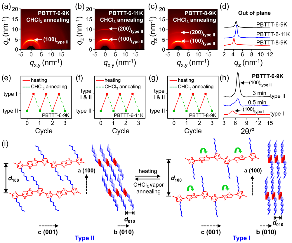 图2.(a-i)低分子量的PBTTT-6和PBTTT-8在热退火/溶剂蒸气退火下的GIXRD图以及晶型转变示意图。