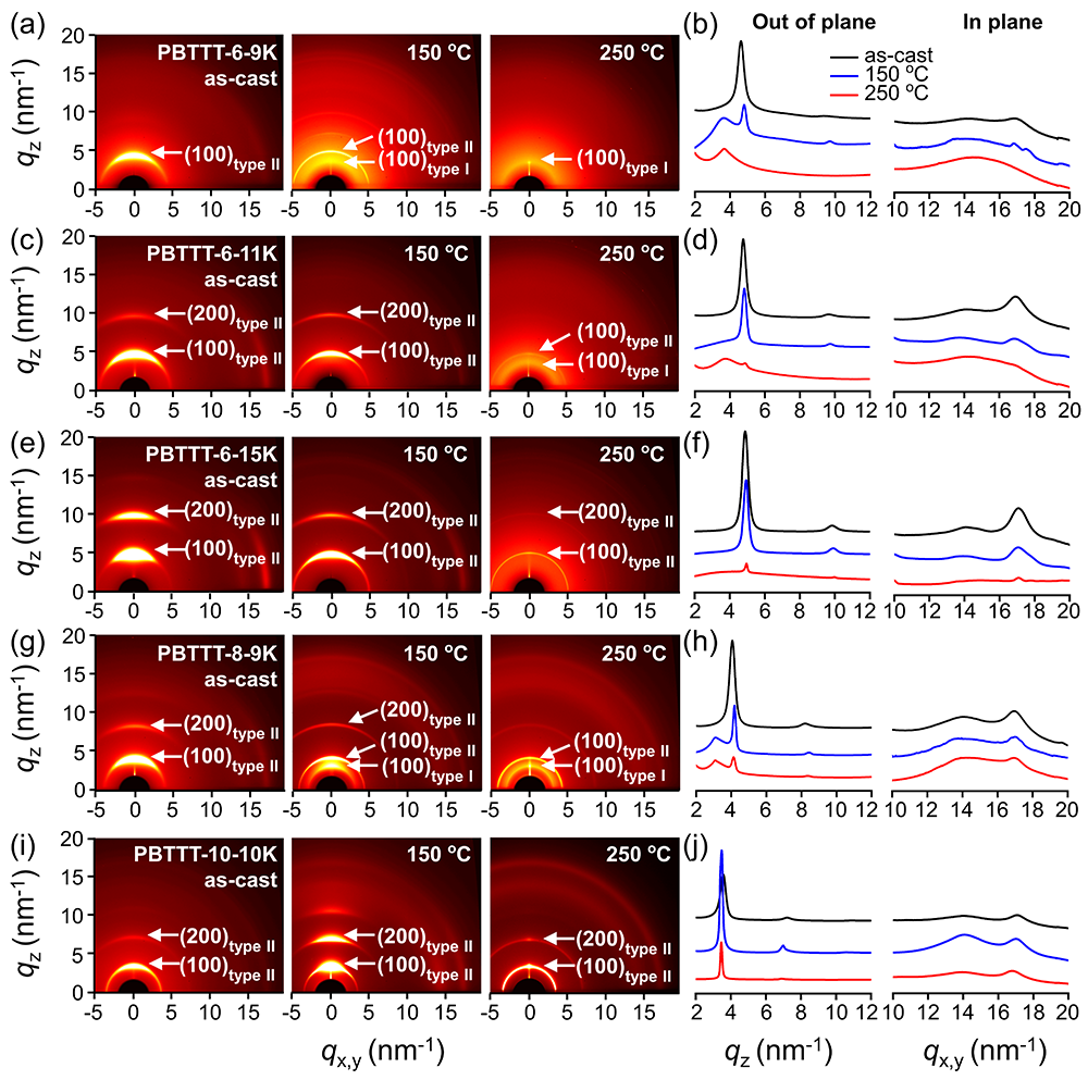 图1.(a-j)不同分子量、不同烷基侧链长度的PBTTT在不同状态下的2D-GIXRD图及1D-GIXRD图。