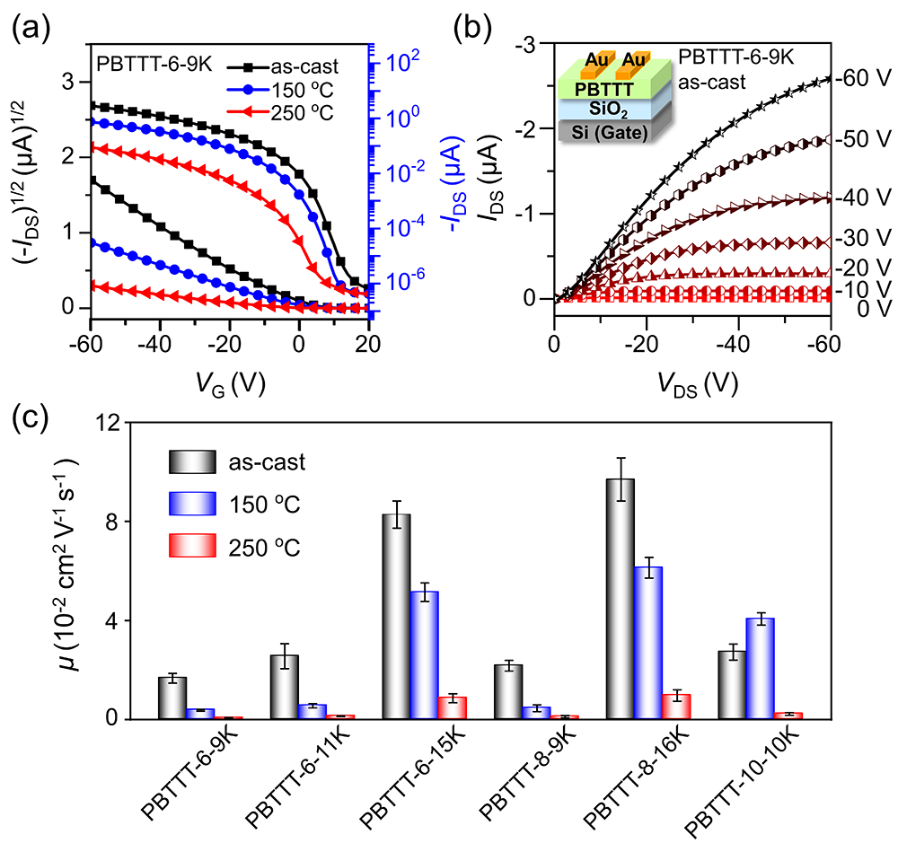图3.(a-c)不同分子量、不同烷基侧链长度的PBTTT在不同状态下的器件性能。