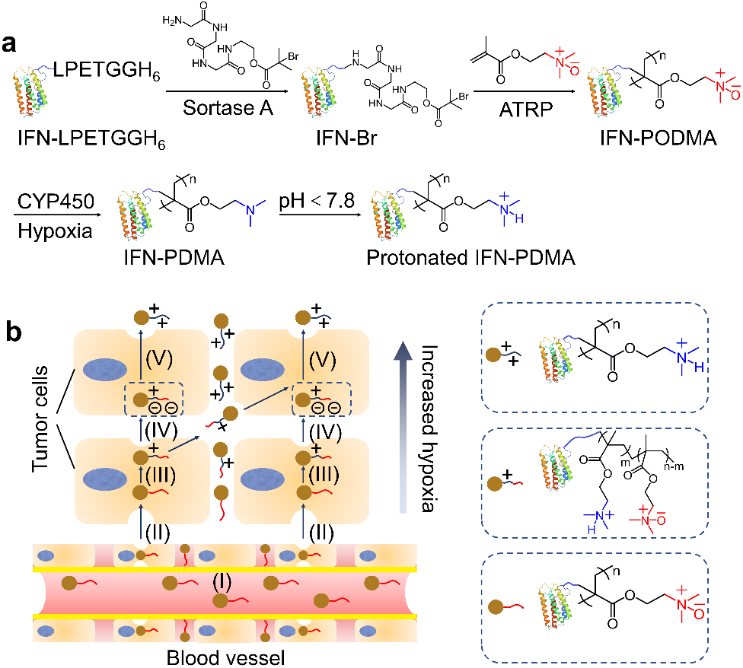 图1 (a) Sortase A酶介导的蛋白质连接和通过原子转移自由基聚合(ATRP)在IFN的C端原位生长IFN-PODMA偶联物;乏氧条件下,CYP450酶催化IFN-PODMA还原为IFN-PDMA;PDMA在酸性条件下进一步质子化。(b) IFN-PODMA可以在体内长循环(I);一旦它进入肿瘤(II);在肿瘤的乏氧区域被CYP450酶还原为IFN-PDMA(III);质子化的IFN-PDMA通过静电吸附作用(IV)与带负电荷的肿瘤细胞通过静电吸附介导的转胞吞作用(V),促使偶联物向肿瘤深处渗透。