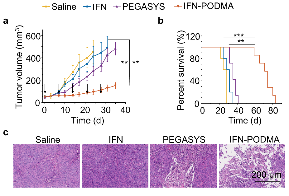 图3. IFN-PODMA在黑色素瘤小鼠模型中的抗肿瘤活性。(a)小鼠肿瘤生长曲线。(b) 小鼠的生存曲线。(c) 治疗后的肿瘤组织的H&E染色。