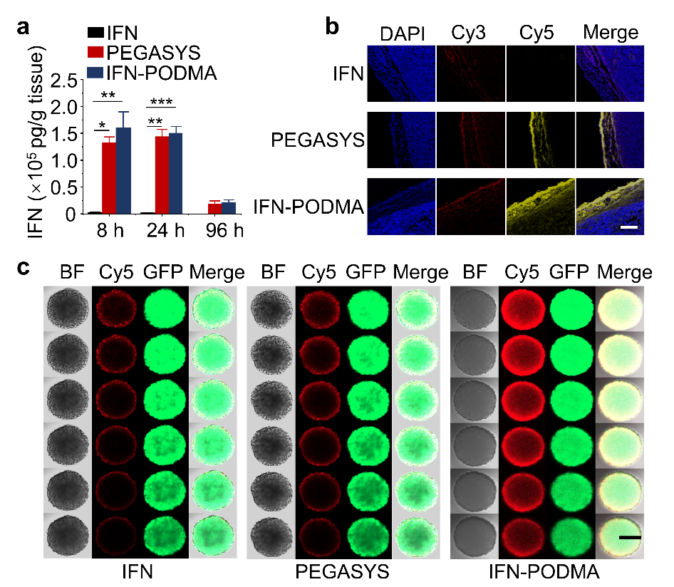 图2. (a) 静脉注射IFN类似物后,在特定时间点的肿瘤中IFN的浓度。(b) 在体内肿瘤中IFN类似物的渗透性。(c) 乏氧条件下,Cy5标记的IFN类似物对C8161肿瘤细胞球(3D MTSs)的渗透情况。