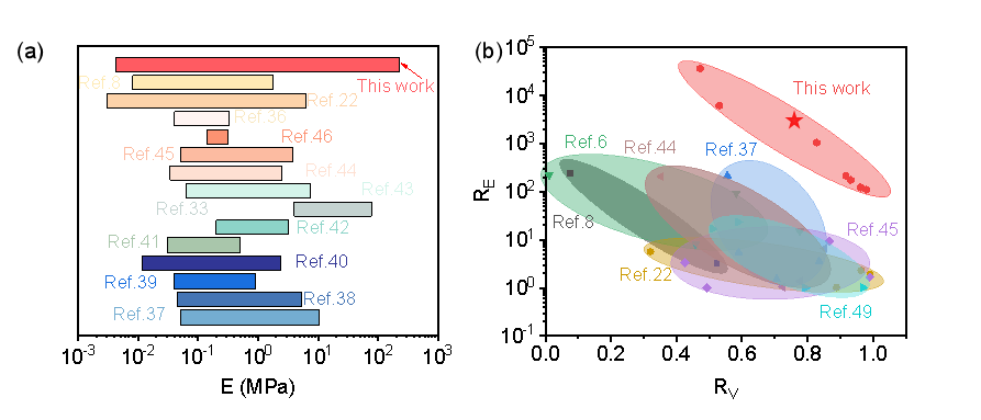图3 (a-b)本工作凝胶的模量范围、模量及体积变化率与已有凝胶的对比。