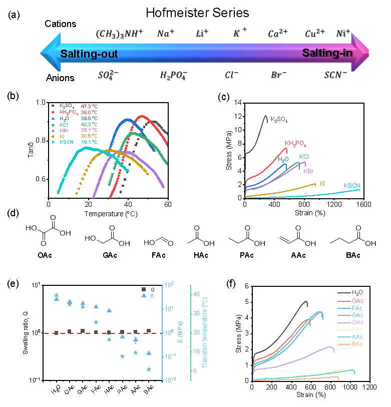 通过细致的实验探究和机理分析,作者证实添加剂通过影响凝胶中的非共价相互作用,改变凝胶中刚性疏水区和柔性亲水区域的强度,从而改变凝胶的玻璃化转变温度,进而在不改变温度的情况下,智能调节凝胶的力学行为。同时,作者发现不同类型的小分子对凝胶机械性能的影响迥异。其中,无机添加剂多通过Hofmeister效应来调节凝胶亲水结构的含水量;而有机添加剂同时影响亲水和疏水区域的强度,从而调节水凝胶的机械行为(图2)。