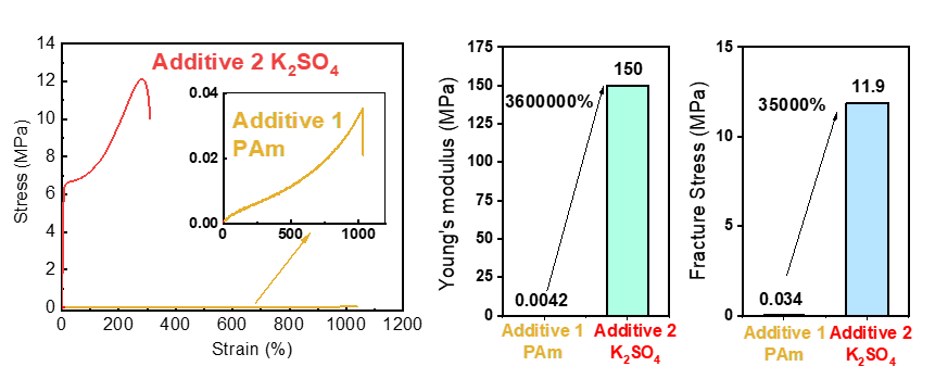 图1 同种水凝胶在两种不同的小分子刺激下的拉伸曲线、杨氏模量和拉伸强度对比。