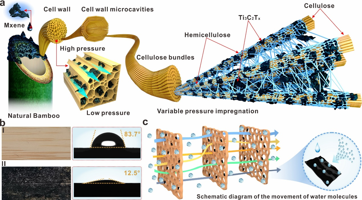 天然竹材具有在多个维度上组装不同层次结构的先天优势,不同的层次结构赋予了竹材宏观上优越的性能。基于模板法构筑纤维素基摩擦电材料主要分为“脱木素”和“减压浸渍”工艺。首先从天然竹材中去除木质素与半纤维素以制备分层多孔的纤维素支架。然后将纤维素支架浸入Ti3C2Tx溶液中进行减压浸渍。最终材料具有高的亲水性和独特的孔道结构为其后续作为湿敏摩擦电材料提供无限应用潜力。