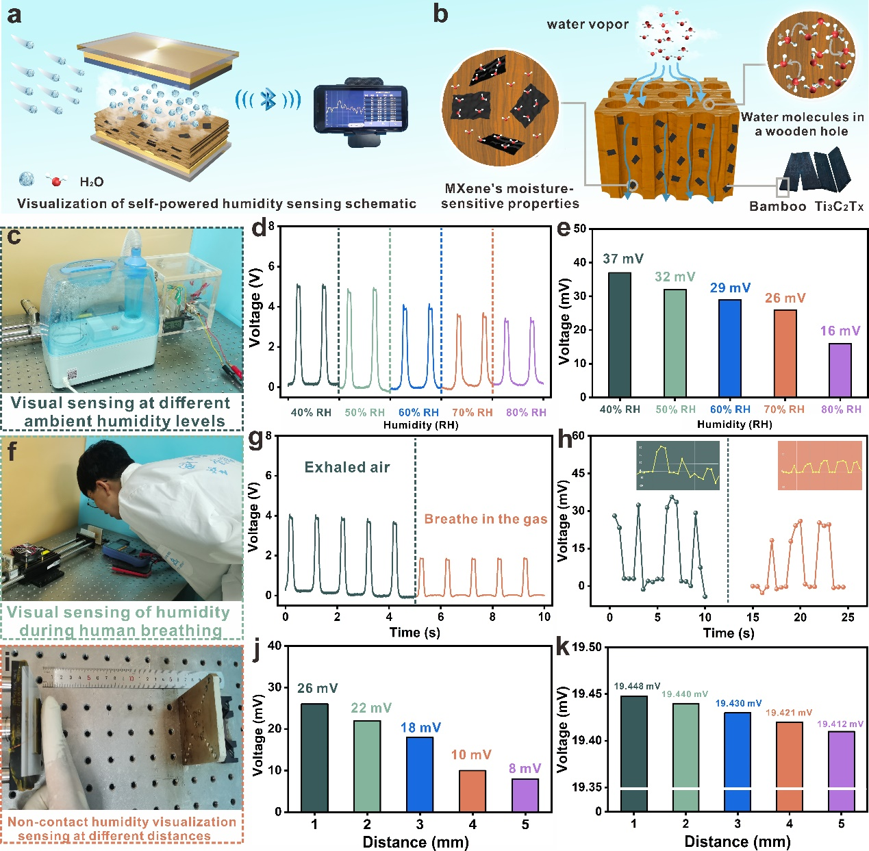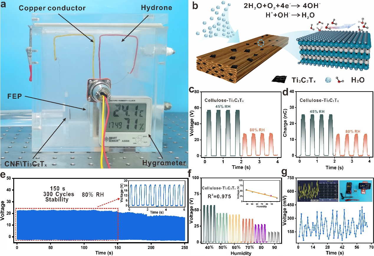 图3. 高湿环境下纤维素摩擦电材料用于自供电传感。