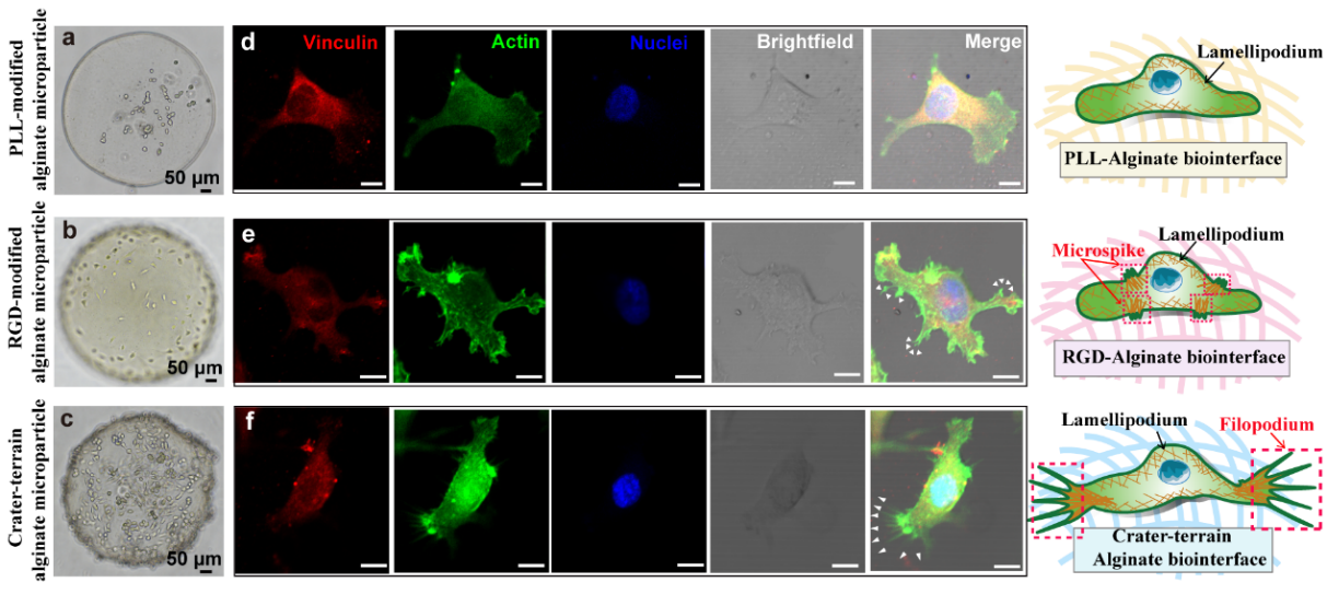 近期,清华大学化学系林金明教授团队设计制造了一种表面具有不规则“凹坑”结构的水凝胶颗粒(Crater–terrain microparticles,CTMs)。在气体剪切辅助的微流控液滴制备器的下方结合一组超声波雾化器,即可在产生液滴的尖端营造一个氯化钙气溶胶反应区。当海藻酸钠液滴从尖端滴落,穿梭过氯化钙气溶胶区域时,会连续地接受大量、随机的超细氯化钙气溶胶撞击,撞击处的液滴表面向内塌陷,同时海藻酸钠-Ca2+快速聚合瞬时冻结了此处的“凹坑”形态。最终海藻酸钠液滴在含有氯化钙的收集皿中固化完全,形成表面遍布“凹坑”的水凝胶颗粒(图1)。氯化钙气溶胶的速度和浓度是制备“凹坑”结构的关键参数,并且光交联水凝胶材料——聚乙二醇二丙烯酸酯同样适用该制备体系(图2)。这些表面粗糙的颗粒可以诱导自发的蛋白质吸附,表层的蛋白质通过与细胞膜表面受体的相互作用,从而指导细胞粘附在颗粒表面(图3)。这些颗粒表现出优越的细胞亲和力,具体表现为高活性增殖、功能蛋白高表达以及多类型细胞的稳固粘附(图4)。这种颗粒通过地形指导了细胞以独特的“手指状”粘附状态在其表面伸展、生长(图5),这种活跃状态对于细胞迁移至关重要。这项研究工作通过自制搭建的微流控系统制备了一种具有独特表面微结构的水凝胶微粒,系统研究了其通过地形特征指导细胞行为的功能和特性,为设计新型细胞微载体提供了新思路。该工作以“Microfluidic Engineering of Crater–Terrain Hydrogel Microparticles: Toward Novel Cell Carriers”为题发表在《ACS Applied Materials & Interfaces》上(10.1021/acsami.2c21104)。文章第一作者是清华大学博士生郑亚婧。该研究得到国家自然科学基金委项目的支持。