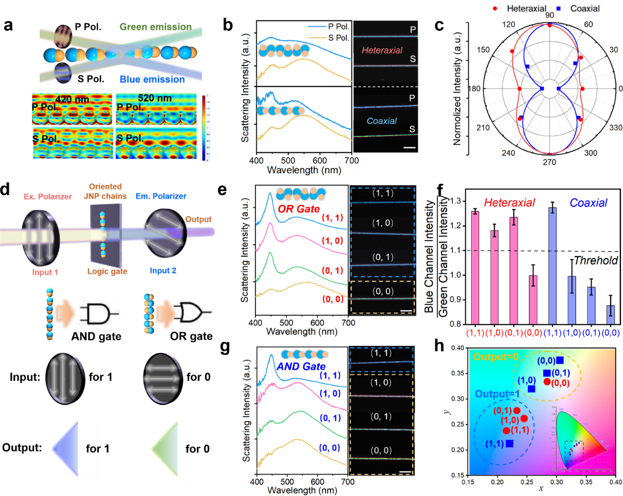 作者进一步研究了取向结构的光学各向异性,并展示了其在逻辑器件中的应用前景。对于一维单颗粒取向结构,Janus颗粒的排列方向可以与链方向耦合,从而加强同轴链的各向异性,削弱异轴链的各向异性,同轴与异轴结构的光散射行为由此表现出不同偏振响应性。将激发光和散射光的偏振状态被用作输入,链的散射光谱被定义为输出后,可以利用组装结构构建逻辑器件。其中,同轴链显示出“与”门的行为,而异轴链显示出“或”门的行为(图4)。
