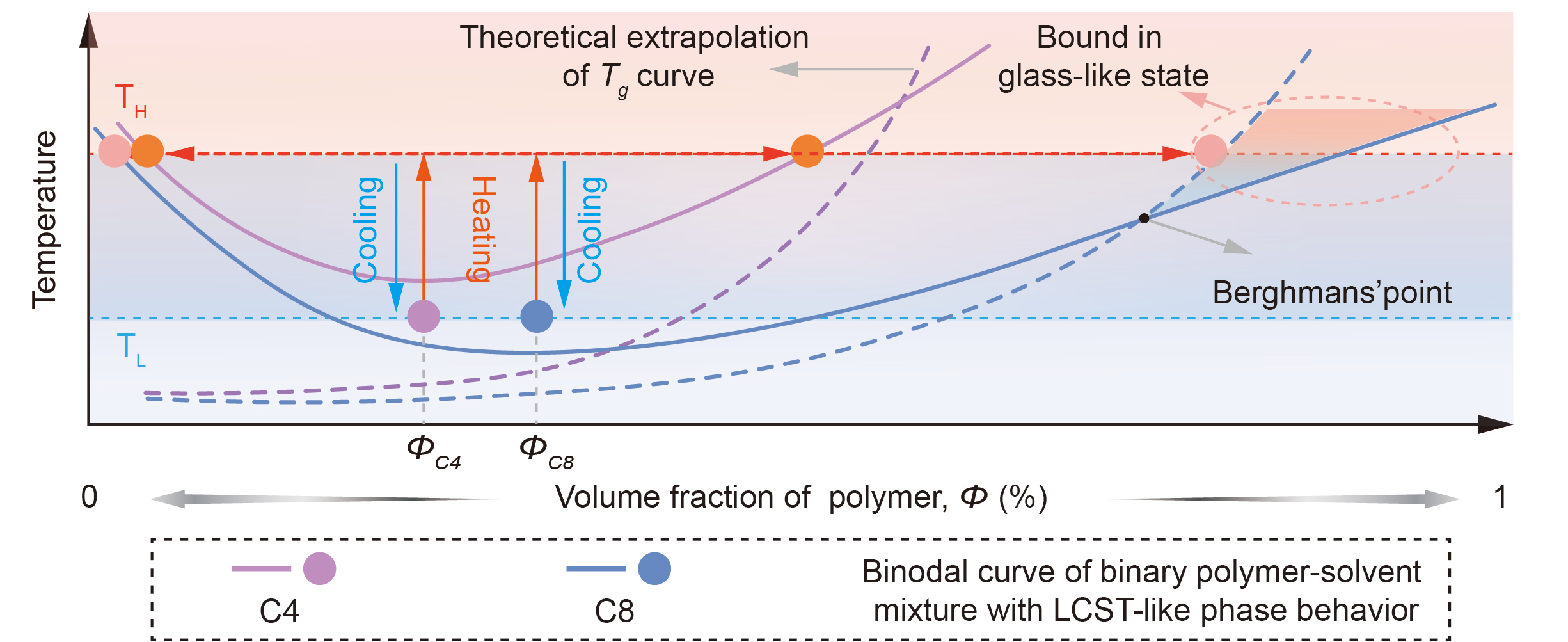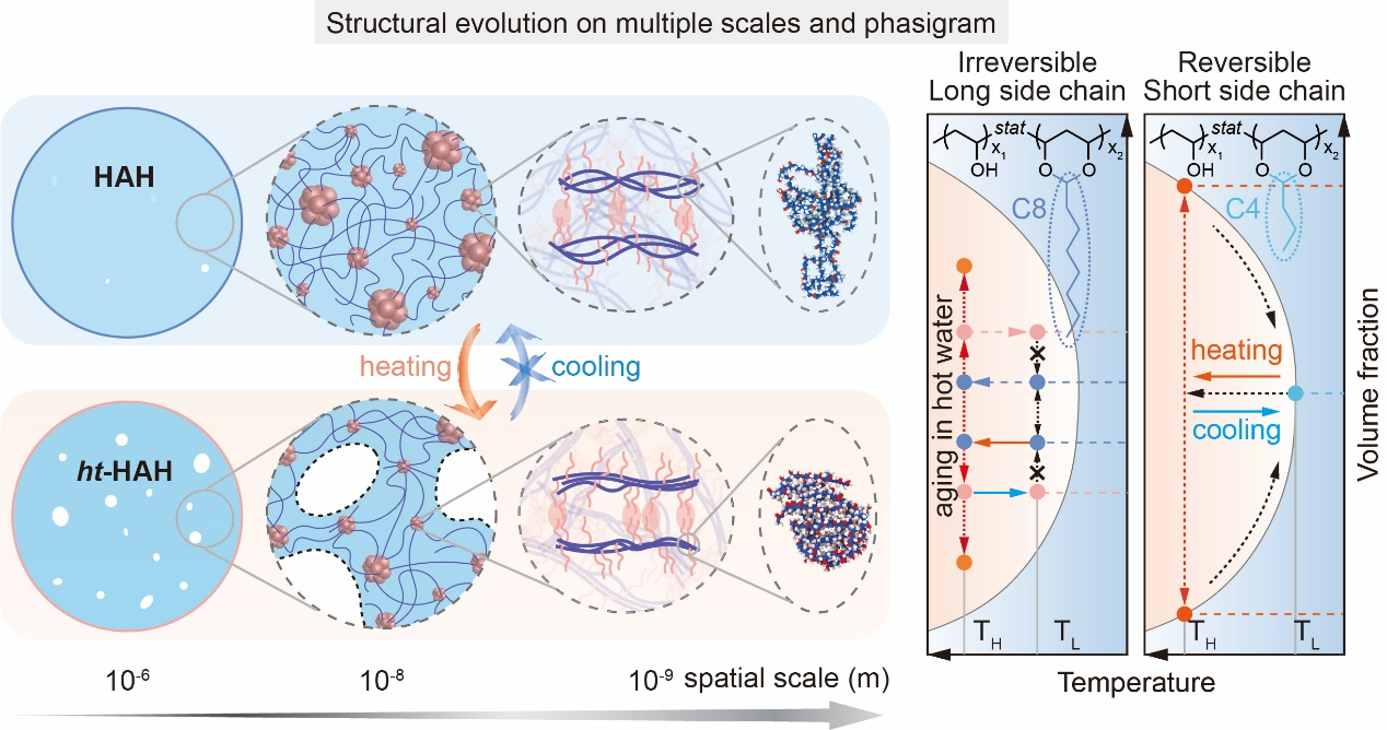 作者探讨了非平衡态到平衡态相分离结构的演化机制,为该机制的进一步推广奠定了理论基础。多尺度结构研究表面,该材料的相结构进化从分子尺度开始,然后相分离结构域的特征尺寸随着时间的推移增长到宏观尺度。加热时疏水相互作用在分子水平上增强,随后在纳米尺度上聚集聚合物链,在微米尺度上发生富相(液滴)聚集。相对于更短的烷烃链结构,该相分离过程赋予了时间依赖性的不可逆孔隙生长,这是由于辛基侧链相对强的相互作用导致类玻璃聚合物相的缓慢动态。从而,我们可以通过简单地控制老化持续时间来控制在小组成间隔内停止相分离的程度,从而平衡其渗透性和透明度。该方法可以推广到其他凝胶体系,只要该体系具备如下两个关键特征(i)处于不平衡状态;(ii)相分离结构域的粗化速率在实验相关时间尺度上应较慢 (比如,相分离温度高于Berghmann点)。