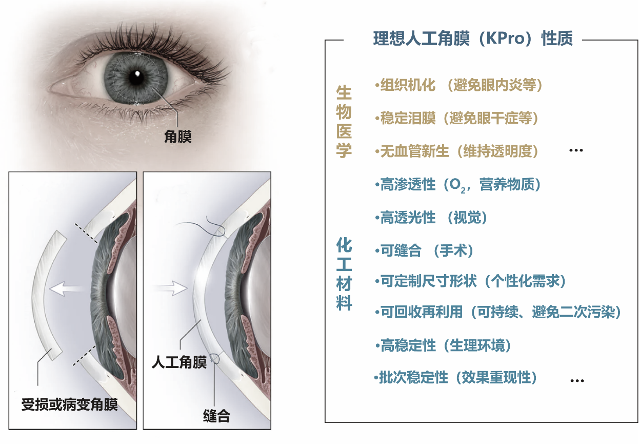 首先,KPro需要能与周边组织完全机化来避免眼内炎,同时上皮需要一个湿环境避免眼干症,还需要避免血管新生。其次,KPro还需要具备透光性来恢复视力,良好渗透性来确保氧气及其他营养物质输送、力学以及环境稳定性,,并不溶解。再次,KPro需要具备可加工性对于满足个性化以及美学需求也非常重要。同时,如同其他生物材料一样,废弃的角膜假体将对人类健康和生态系统构成不可预见的风险注,因此下一代人工角膜需具备可回收性,满足资源再利用的可持续发展观念。最后,人工角膜假体的材料制备工艺需要兼具可规模化以及批次稳定性,批次间的高变异性,无法获得可靠、可复现的结果。如何系统性地实现KPro的高效组织机化能力,动态且强韧的结构性能,优异的环境耐受性、友好性以及极高的批次稳定性,需要眼科学以及高分子化工材料等多学科领域的并行协作。