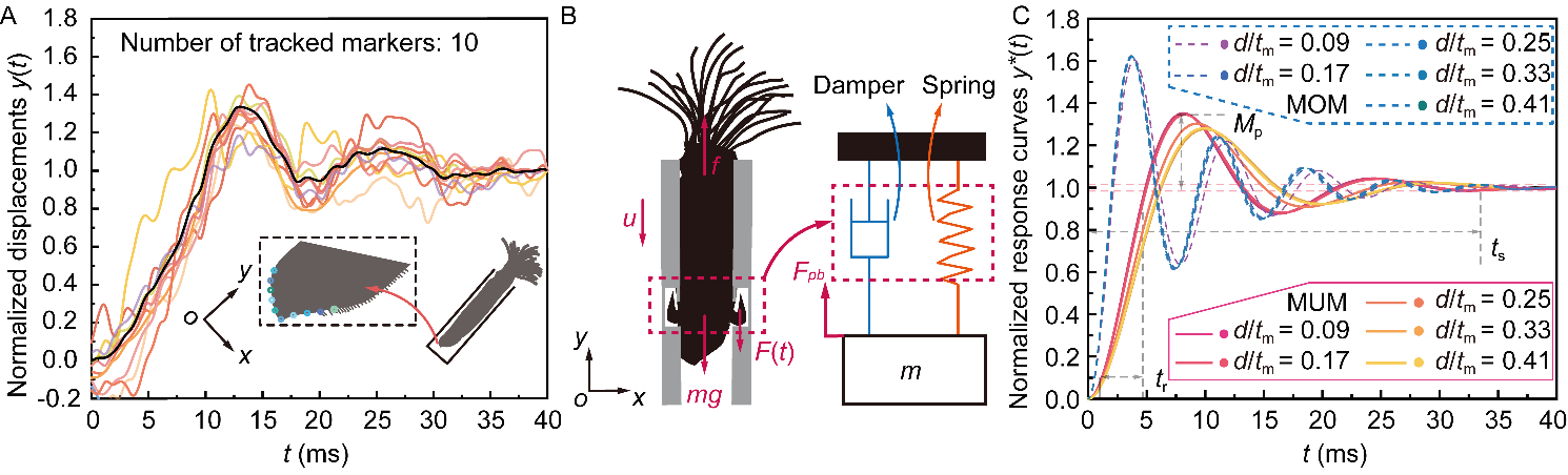此外,课题组还通过对扇形管虫的运动学分析,结合理论建模与实验验证,阐明了基于软材料的能量吸收器与刚性能量吸收器相比在稳定辅助中优势(图4)。这种综合的机械特性可能为水下软体机器人的柔性保护装置的设计提供设计参考。
