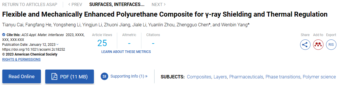 为了解决上述问题,杨文彬教授团队通过乳液模板及界面缩聚法在Pn@PWO相变微胶囊表面构筑二氧化硅层(SiO2),并将改性后的微胶囊填充到水性聚氨酯中,制备柔性相变复合材料(图1)。通过钨酸铅外壳和二氧化硅层的双壳层结构,增强了微胶囊的防漏性能及热循环稳定性,同时富含极性基团的SiO2层引入,改善微胶囊的润湿性(图2)。微胶囊良好的润湿性及氢键网络的形成,改善微胶囊与聚氨酯基体的界面相容性,提高复合材料的力学性能。WPU/Pn@PWO@SiO2相变复合材料的拉伸强度达到10.98MPa,是WPU/Pn@PWO相变复合材料的7倍以上(图3)。此外,相变复合材料也表现出超过41 J/g的潜热容量,良好的热循环稳定性、热调节性能以及γ射线屏蔽性能。在105.3 keV和86.5 keV时,质量衰减系数分别为1.38 cm2/g和1.12 cm2/g(图4、5)。这些性能将极大地促进相变复合材料在具有热调节功能的γ射线屏蔽装置中的应用,例如涉核工作者的防寒服、具有保温功能的防辐射建筑板材。同时,也为开发高性能和多功能相变复合材料的应用提供了新思路。该工作以“Flexible and Mechanically Enhanced Polyurethane Composite for γ-ray Shielding and Thermal Regulation”为题发表在《ACS Applied Materials & Interfaces》上。文章第一作者是西南科技大学材料与化学学院博士研究生蔡天瑜,通讯作者为西南科技大学环境友好能源材料国家重点实验室杨文彬教授,该研究得到国家自然科学基金委的支持。
