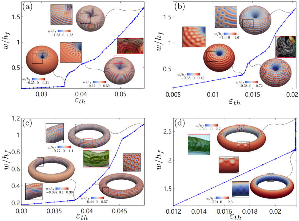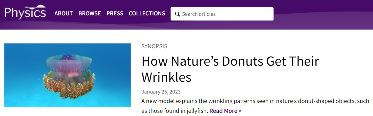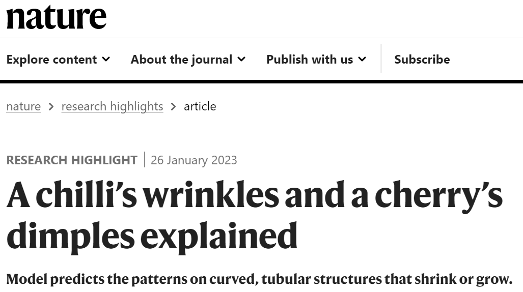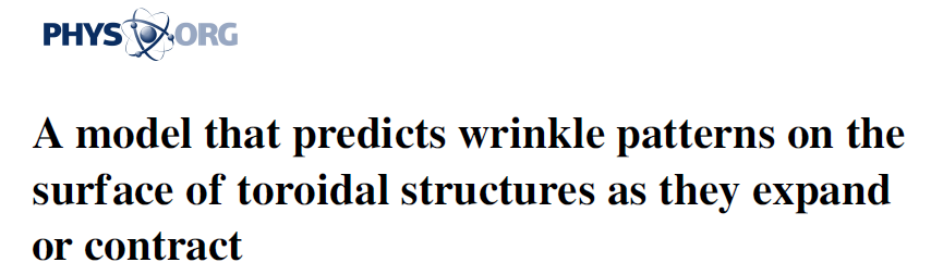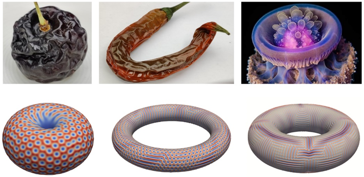 自然界中奇妙的褶皱图案吸引了众多学者去探索其物理起源与生物学功能。近日,复旦大学徐凡教授课题组揭示自然界中普遍存在的环形核壳结构(包含正、零、负高斯曲率)变形后会产生变曲率诱导的复杂表面褶皱斑图(图1),建立了非线性环壳力学模型并解释了形貌弹性内在机制,绘制了多相模态共存相图。相关研究成果以《曲率调控圆环多相模态》(“Curvature-Regulated Multiphase Patterns in Tori”)为题发表于《物理评论快报》(Phys. Rev. Lett., 130, 048201),被美国物理学会Physics网站以Synopsis专题评论报道(How Nature’s Donuts Get Their Wrinkles, Physics, 16, s5),被《自然》以Research Highlights专文报道(A chilli’s wrinkles and a cherry’s dimples explained, Nature, doi:10.1038/d41586-023-00132-y),被PhysOrg专文报道(A model that predicts wrinkle patterns on thesurface of toroidal structures as they expandor contract)。
