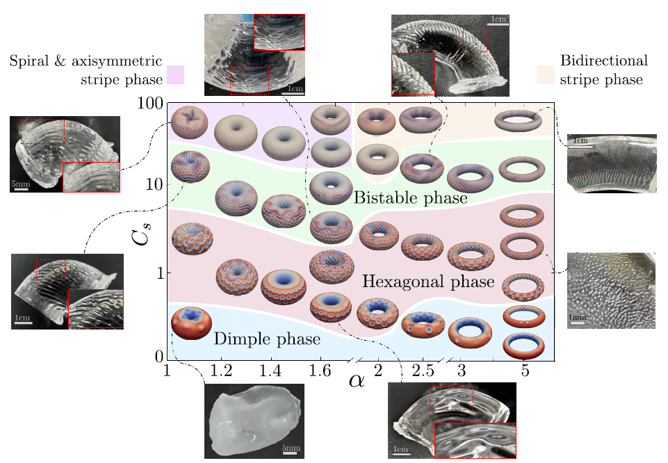 自然界中许多生物组织具有非均匀变曲率的核壳结构,与单一均匀曲率结构相比,其表面褶皱斑图表现出更复杂多变的形貌。为理解其内在的物理力学机制并预测形貌演化过程,研究人员建立了基于微分几何的核壳力学模型,揭示了有效表征环形非均匀曲率上多相共存褶皱形貌选择的普适的标度律规律,发现了可表征核壳环面上模态选择的两个关键无量纲参数CS和α (刚度与曲率)。进一步通过识别迟滞环和麦克斯韦能量条件,解释了多相转变和双稳态模态存在的物理机制。