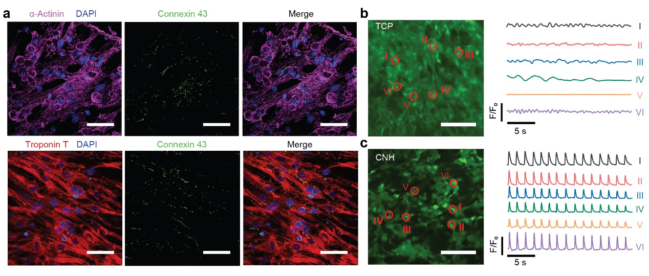 新生大鼠心肌细胞被种植在CNH样品上,在CNHs上生长的心肌细胞快速成熟,表现为良好的细胞排列和心脏特异性蛋白的显著表达(图5a),其中α-肌动蛋白和肌钙蛋白T负责心肌收缩,连接蛋白43参与电和机械耦合的间隙连接。此外,钙瞬态成像显示,CNHs培养的心肌细胞与TCP培养的心肌细胞有明显的收缩行为。培养在刚性且不导电的TCPs上的心肌细胞表现出弱而随机的兴奋,与细胞之间没有协调(图5b)。相反,附着在CNH上的细胞表现出自发和同步的兴奋,由柔软和导电CNH基质促进机电传导(图5c)。