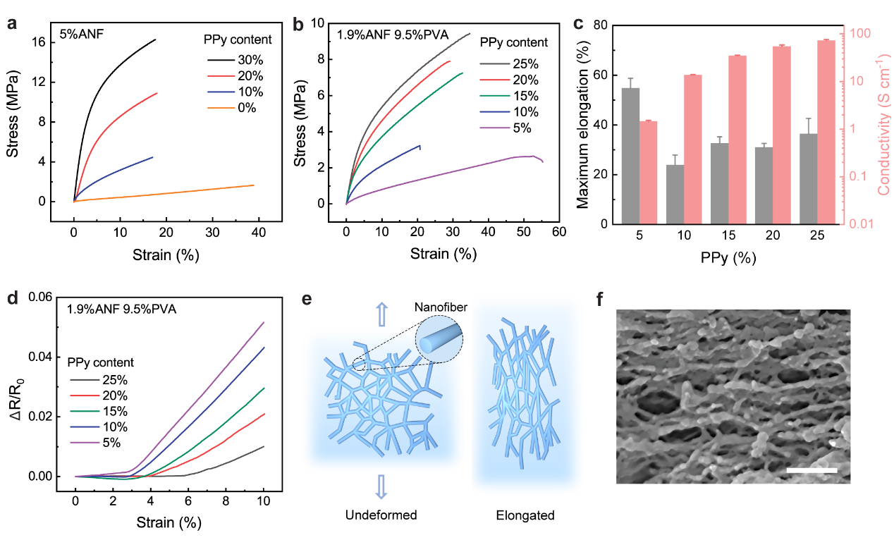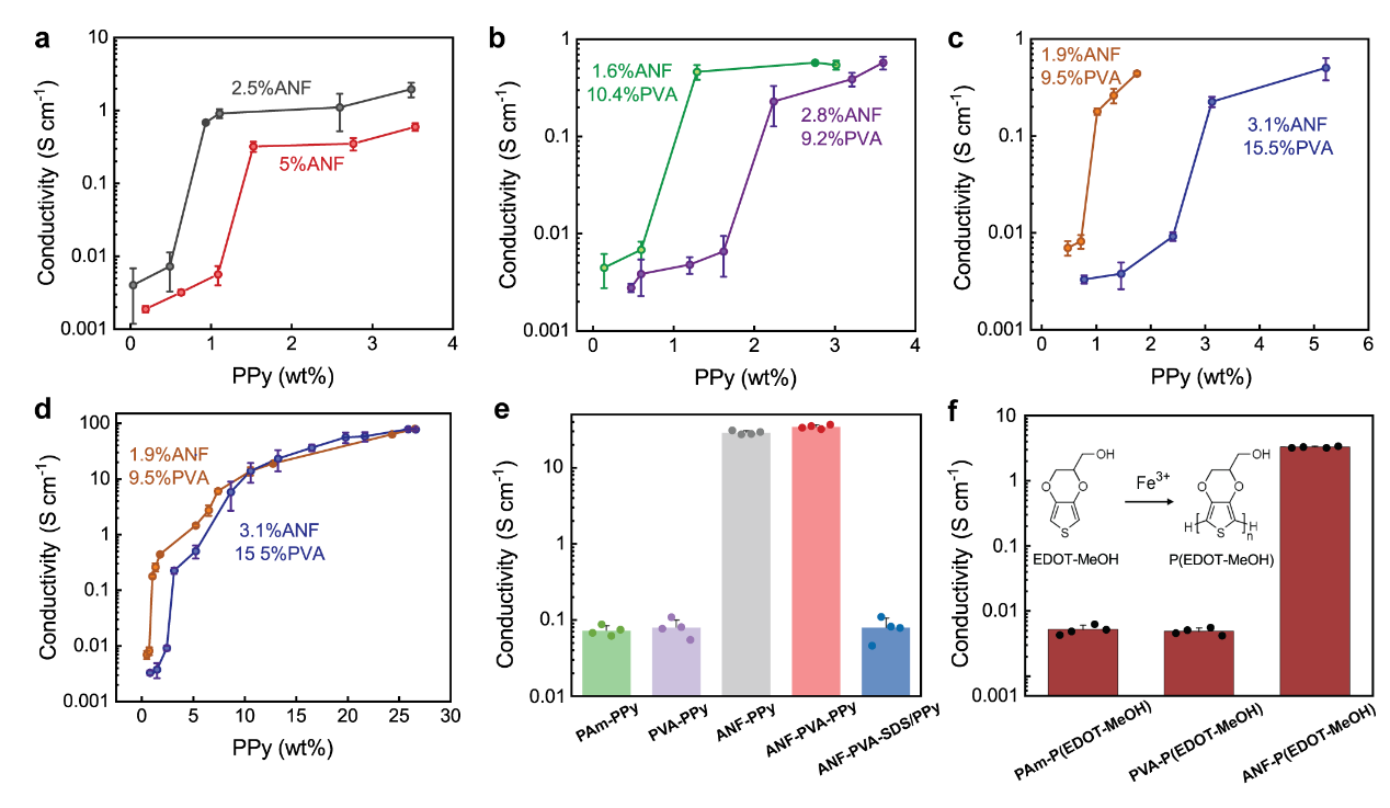 在高度连接的纳米纤维模板的引导下,PPy以非常低的体积分数组装成渗透传导通路,在5 wt% ANFs的CNHs中PPy的渗透阈值略高于1 wt%。在2.5 wt% ANFs的CNHs中,PPy的渗透阈值下降到1wt %以下(图2a)。这一现象可以理解为纤维网络越稀疏,形成连续导电通路所需的PPy越少,对应形成传导通路的阈值越低。这种现象在加入PVA后依然存在(图b,c和d)。对一系列其他无ANF的水凝胶进行验证后,证明了ANF的模板作用(图e),且这种模板作用也适用与其他常用的导电聚合物如PEDOT图(图f)。