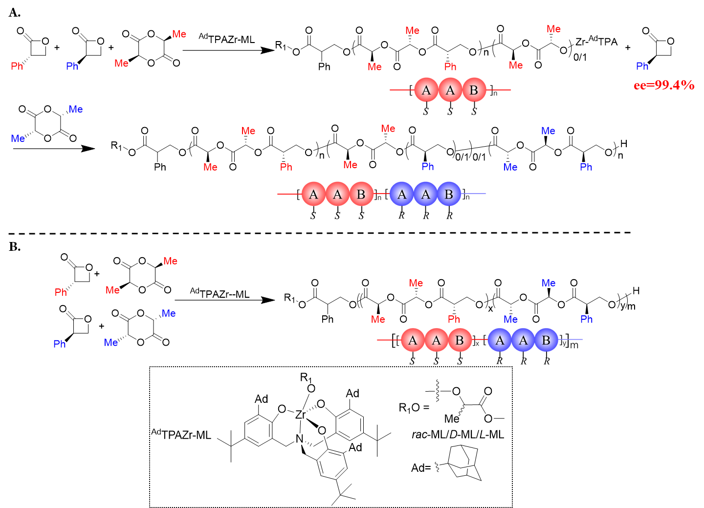 最近,兰州大学邬金才课题组发展了S,S-丙交酯(L-丙交酯)和外消旋托品酸内酯的三组分相似(酯)且不同尺寸(四元环和六元环)单体的选择性可控共聚的新体系(图1)。发现在没有对映纯催化剂/引发剂的情况下,可以从S,S-丙交酯、S-托品酸内酯和R-托品酸内酯的三组分单体混合物中通过单体促进动力学拆分选择性地获得S,S-丙交酯和S-托品酸内酯的同规交替共聚物,具有非常高的动力学拆分效果其动力学拆分系数Krel>300,未反应的托品酸内酯的ee值为99.4%和高达96.0%的单体交替度(图1A)。通过改变单体丙交酯的手性可实现剩余托品酸内酯手性及聚合物手性的反转。剩余的R-托品酸在加入R,R-丙交酯(D-丙交酯)后可以进一步插入共聚物中形成嵌段共聚物。与以往通过聚合或有机反应的不对称动力学拆分外消旋化学物质相比,该体系不需要对映纯催化剂/引发剂。更重要的是,这种单体促进不对称动力学拆分交替共聚的方法可以应用于从外消旋丙交酯和外消旋托品酸内酯的四组分单体混合物中合成具有-((ASASBS)x-ran-(ARARBR)y)n_立体结构的交替共聚物(图1B)。