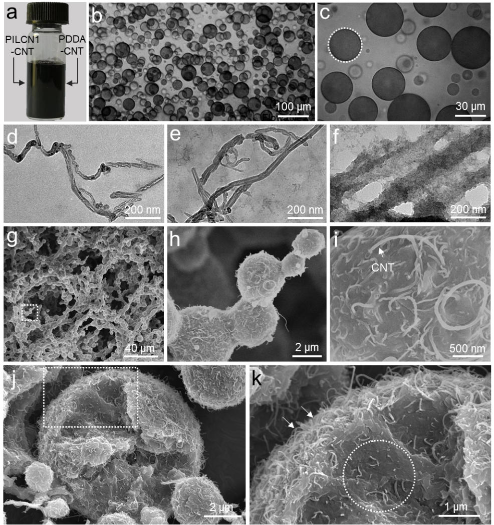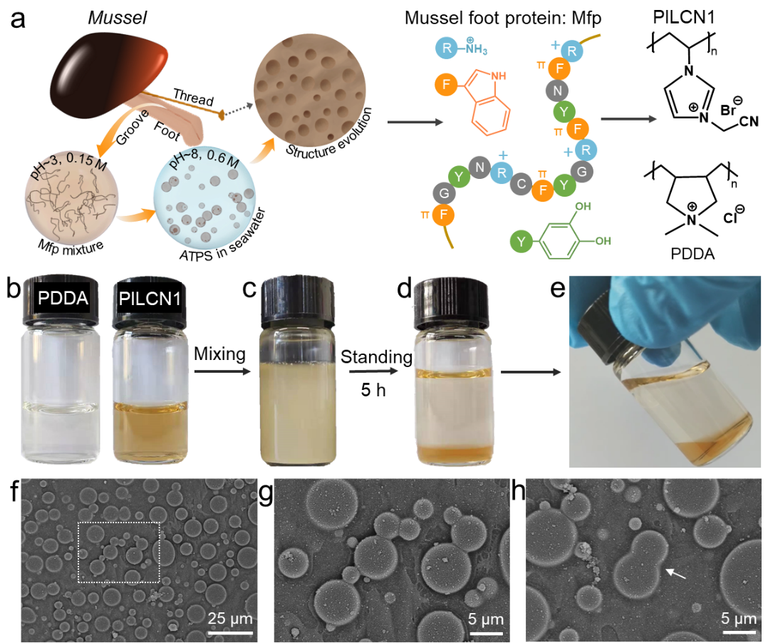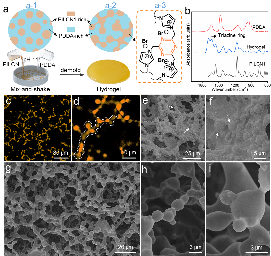 近日,华中科技大学化学与化工学院赵强教授课题组受贻贝足蛋白相变的启发,设计合成了兼具液液相分离能力和可交联性的聚离子液体(PILCN1)。将PILCN1水溶液与聚(二甲基二烯丙基氯化铵)(PDDA)水溶液共混后,PILCN1通过氰基与咪唑阳离子间的超分子吸引力而发生液液相分离,形成双水相体系,上下层液体分别富含PDDA和PILCN1(图1)。在机械振荡作用下,PILCN1-PDDA双水相体系转变为双连续相结构。在碱性条件(pH 11)下,PILCN1的氰基发生环化反应,促使双水相体系发生快速的选择性固化,形成海绵状的大孔水凝胶(图2)。该研究实现了双水相体系的微结构调控与固化。