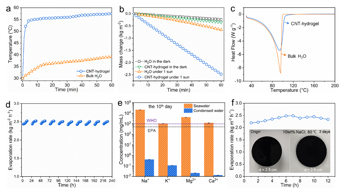 研究者们将碳纳米管(CNT)引入PILCN1-PDDA双水相体系中,使得CNT富集在PILCN1浓相中,制备了CNT杂化的大孔水凝胶(图3)。在1 kW/m2的辐照强度下,该水凝胶表现出良好的光热转化性能,稳定的海水蒸发速率(2.5 kg/m2h)以及优异的耐盐性(图4)。该研究成果以“Liquid sculpture and curing of bio-inspired polyelectrolyte aqueous two-phase systems”为题发表于国际学术期刊Nature Communications。华中科技大学张重锐博士为论文的第一作者,赵强教授为论文通讯作者。该研究工作得到了国家自然科学基金项目的支持。