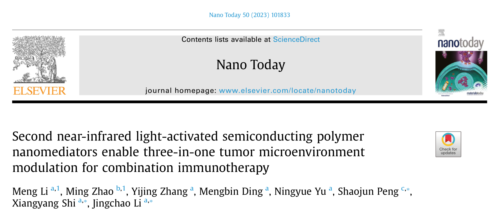 该研究成果以“Second near-infrared light-activated semiconducting polymer nanomediators enable three-in-one tumor microenvironment modulation for combination immunotherapy”为题发表在Nano Today(影响因子18.962)。论文第一作者为东华大学硕士生李萌,通讯作者为东华大学李静超研究员、史向阳教授和暨南大学附属珠海市人民医院彭绍军副教授。本研究工作得到国家自然科学基金,上海市高校特聘教授(东方学者)、上海市科委和中央高校基本科研基金等项目资助。
