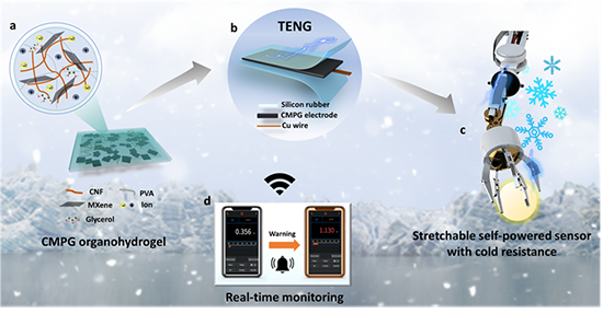 随着物联网的快速发展,在工业生产、矿产开采、生物医学等领域中使用智能机器人取代传统人力已成为一种趋势。因而,实时准确监测其工作状态显得尤为重要,迫切需要开发多功能、高性能的传感器来满足这一需求。近年来,柔性摩擦纳米发电机(TENG)作为一种新型自供电能量转换装置,因其重量轻、成本低、无需外部电池供电等优势而备受关注。然而,作为TENG的关键模块,电极材料的可拉伸性与极端低温耐受性是影响应用的关键因素,相关性能仍亟需提升。