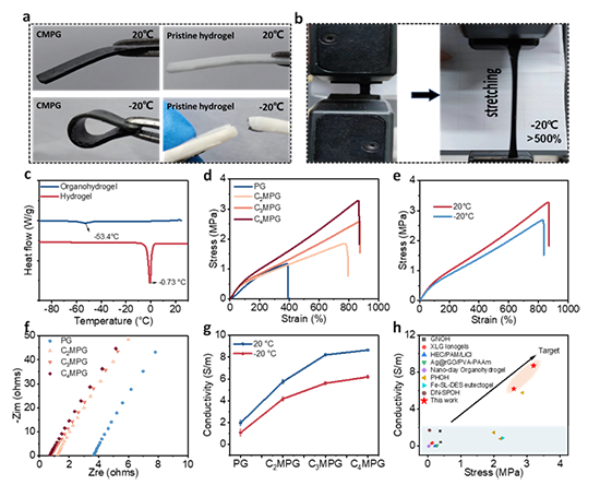 图2.有机水凝胶在低温下的力学性能和导电性。