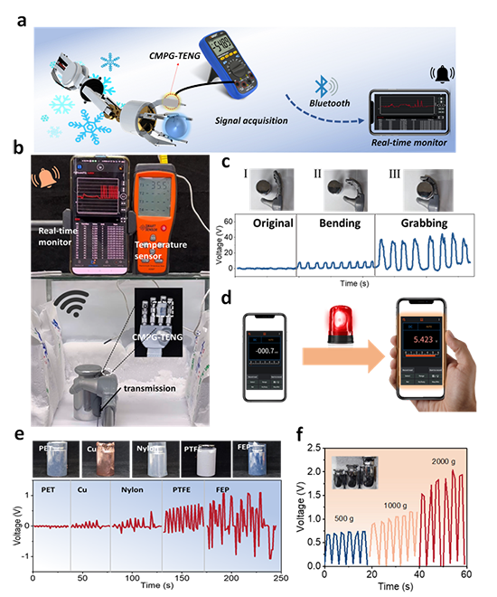 图3. 有机水凝胶基TENG自供电监测机器手低温工作状态的应用展示。