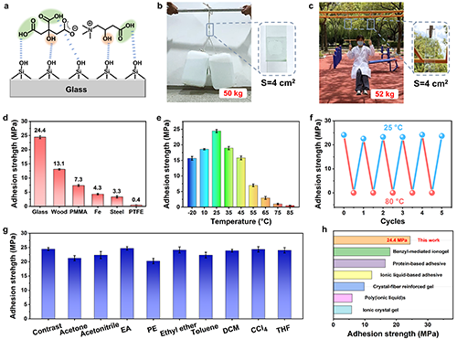 由于富含丰富的羧基和羟基,离子凝胶可以与富含硅羟基的玻璃基板形成强相互作用。离子凝胶的粘附强度达到24.4 MPa,粘附面积仅为4 cm2的玻璃片能够提起50 kg的水桶或约52 kg的成年人。在室温下,离子凝胶对玻璃、木材、PMMA、Fe和不锈钢的平均粘附强度分别为24.4、13.1、7.3、4.3和3.3 MPa(粘附24 h,粘附面积为0.15 cm2)。