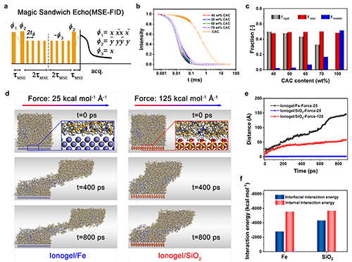 低场固体核磁共振谱被用来解释聚合物的原位片段动力学。通过低场核磁表征手段得到离子凝胶的自由感应衰变信号,然后通过相应的函数拟合得到各组分的弛豫时间和相对分数,证实了PDMAA与CAC良好的相互作用。有效调节内聚能和界面能的平衡是实现强附着力的必要条件。利用分子动力学模拟计算了离子凝胶与离子凝胶/底物的相互作用能,说明离子凝胶内聚能和界面能得到了有效平衡,进一步解释了离子凝胶具有良好粘附性能的机理。