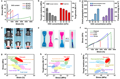 超分子溶剂可以通过氢键和静电相互作用与聚合物链形成强相互作用。溶剂的含量越高,网络中聚合物链之间的距离越长,聚合物链的缠结越少,离子凝胶的可拉伸性越高。通过调节CAC的含量可调节离子凝胶的力学性能。离子凝胶的极限断裂应力(14.4 MPa)、极限断裂应变(4900%)、韧性(115 MJ m?3)和杨氏模量(48 MPa)超过了报道的韧性水凝胶/离子凝胶、双网络水凝胶/离子凝胶、相分离水凝胶/离子凝胶、复合离子凝胶,和超分子离子凝胶。