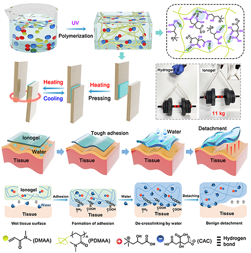 由于缺乏能量耗散机制,离子凝胶强度低,变形能力差,对裂纹扩展敏感,严重影响了其寿命和使用范围。目前,通过配位超分子溶剂、原位相分离或超分子溶剂与应力诱导结晶的协同作用等策略制备高强度离子凝胶的研究取得了很大进展。然而,由于聚合物网络和溶剂之间强烈的分子间相互作用,高强度离子凝胶具有较高的分子内聚能,从而导致与底物的界面粘附较弱。因此,实现高强度和高粘附强度的离子凝胶仍然是一个巨大的挑战。此外,离子凝胶的再利用和回收是必要的,具有高粘附强度的可逆粘合剂具有很大的实际应用前景。