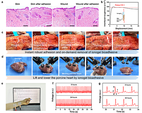 剥离试验结果表明,离子凝胶粘合剂与皮肤组织具有很强的粘附性(约191.1 J m?2)。离子凝胶的这一特性使其在临床应用中具有很高的优势,包括组织伤口粘附和器官的非破坏性转移。对于潮湿的组织表面,离子凝胶粘合剂能够迅速吸附界面水,与生物组织表面的活性基团形成物理交联。在吸水过程中,水破坏了离子凝胶中的部分氢键,使其膨胀,同时形成机械相容模量和适用的粘附强度,以粘附和保护组织界面。由于羟基和羧基的水合作用,足量的水溶液可以完全破坏粘附界面的动态物理交联,因此可以用生理盐水实现按需良性分离(使用生理盐水溶液模拟手术条件)。
