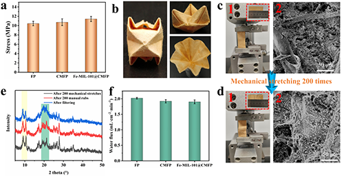 图2 Fe-MIL-101@CMFP的拉伸、柔性、稳定性和过滤性能