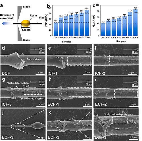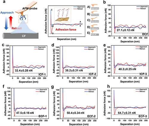 近期,该团队受到蜘蛛丝启发,制备了三种不同支化度的超支化聚酰胺胺(HPAA),系统研究了不同支化度与氢键密度的关系,结合2D FTIR和界面粘附力微观测量技术研究了氢键作用的类型和大小,基于EPD法引入了氧化石墨烯(GO)至纤维表面,构建了具有不同氢键密度的界面相结构。结果表明,具有高氢键密度的纤维表面提供了更多的氢键相互作用位点,促进了GO的沉积。得益于界面粘附力、表面能和界面厚度的改善,功能化CF/EP复合材料的界面强度和断裂韧性分别比未经处理的CF/EP复合材料提高了94.5%和110.0%。界面性能的增强机理归因于“纳米渔网”结构的形成,促进了应力传递和额外能量的吸收。本文提出的通过调控超支化聚合物的支化结构进而调节分子间作用力的方法为高性能纤维表面改性提供了一种先进的途径。