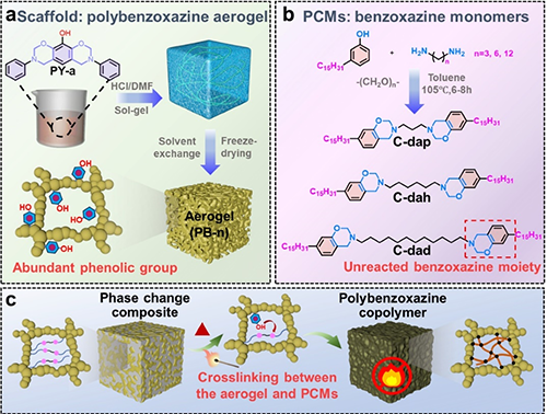 图1. 聚苯并噁嗪气凝胶和苯并噁嗪基PCM的设计及其“高温触发交联”机制